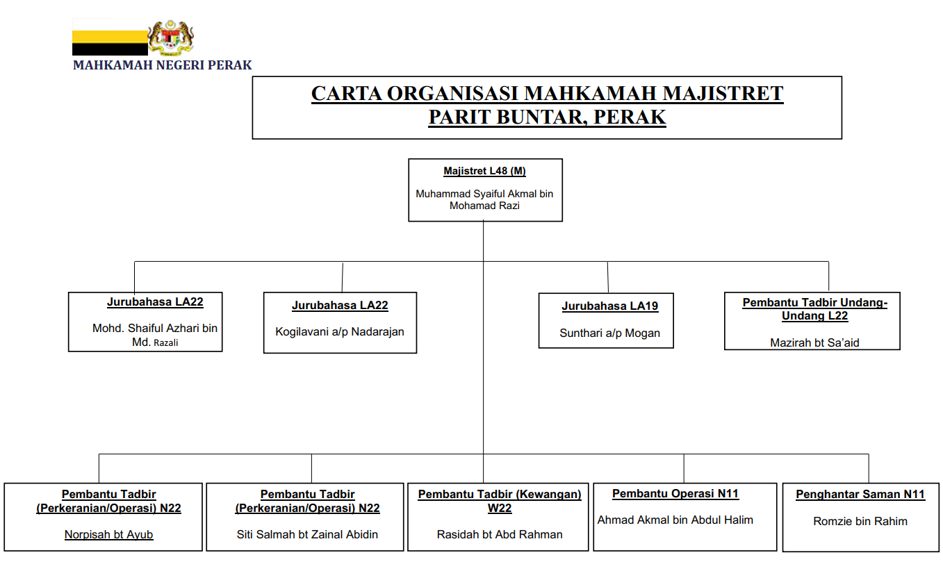 Menerima dan merekodkan urusan surat-menyurat Majistret Mahkamah Parit Buntar sebelum diedarkan kepada pegawai dari unit yang bertanggungan.